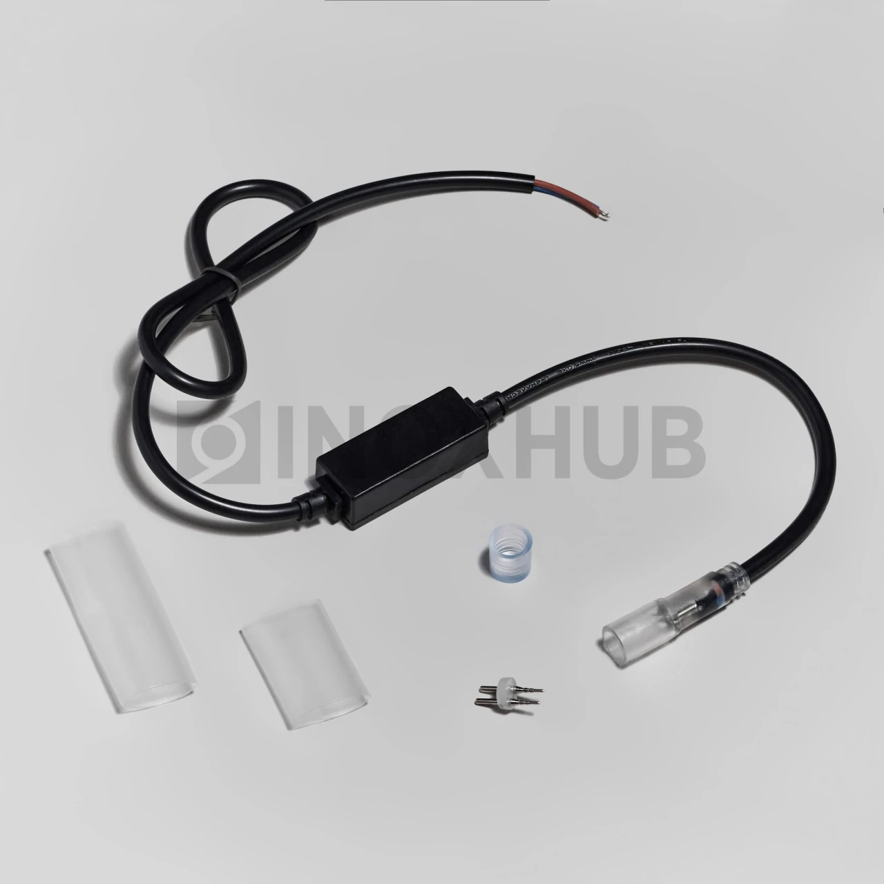 Комплект содержит 5 составляющих: блок питания, соединительную иглу блок питания-дюралайт, 2 термоусадки и заглушку.